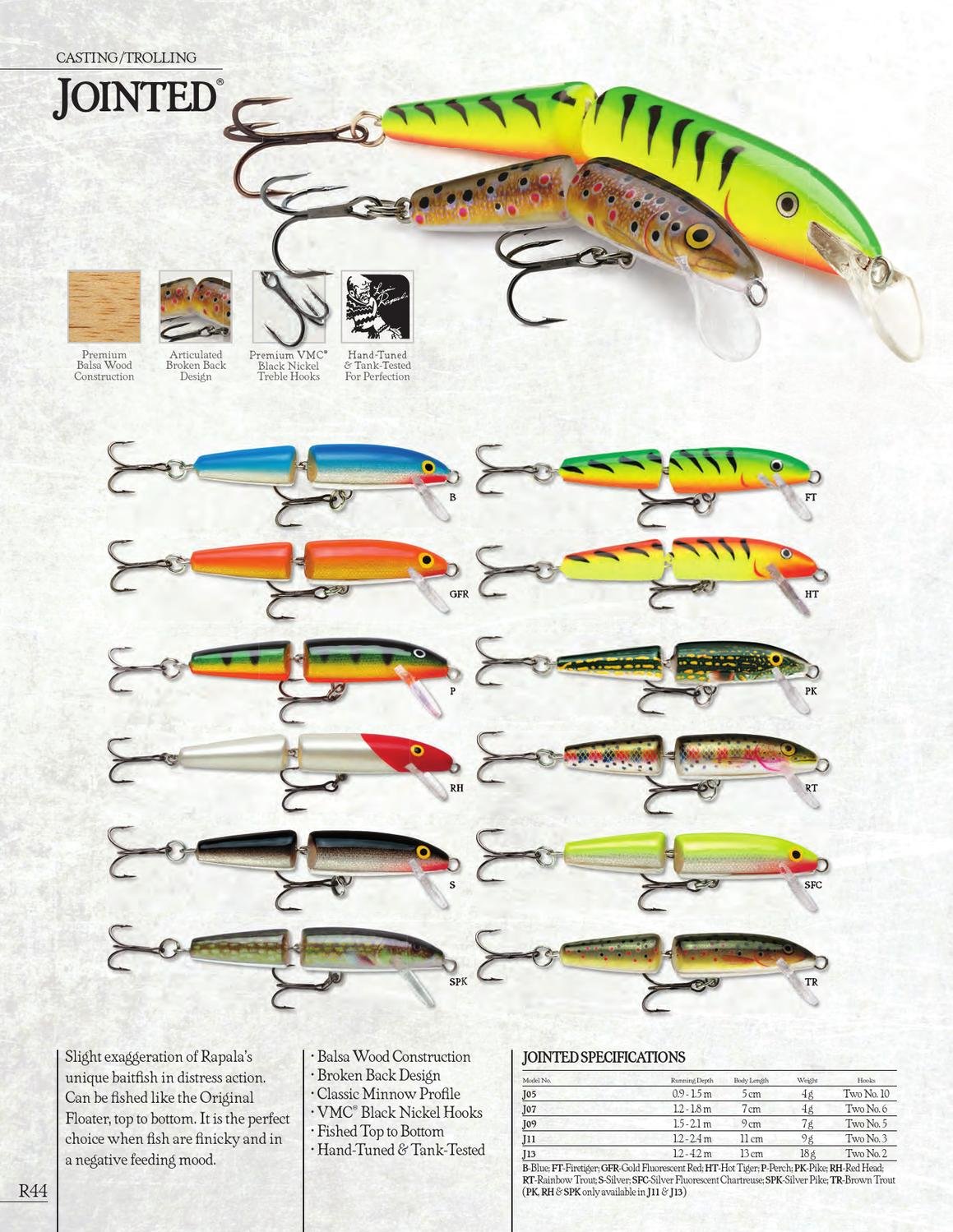 Rapala Jointed is a slight Exaggeration of Rapala’s unique baitfish in distress action. Can be fished like the Original Floater, top to bottom. It is the perfect choice when fish are finicky and in a negative feeding mood.